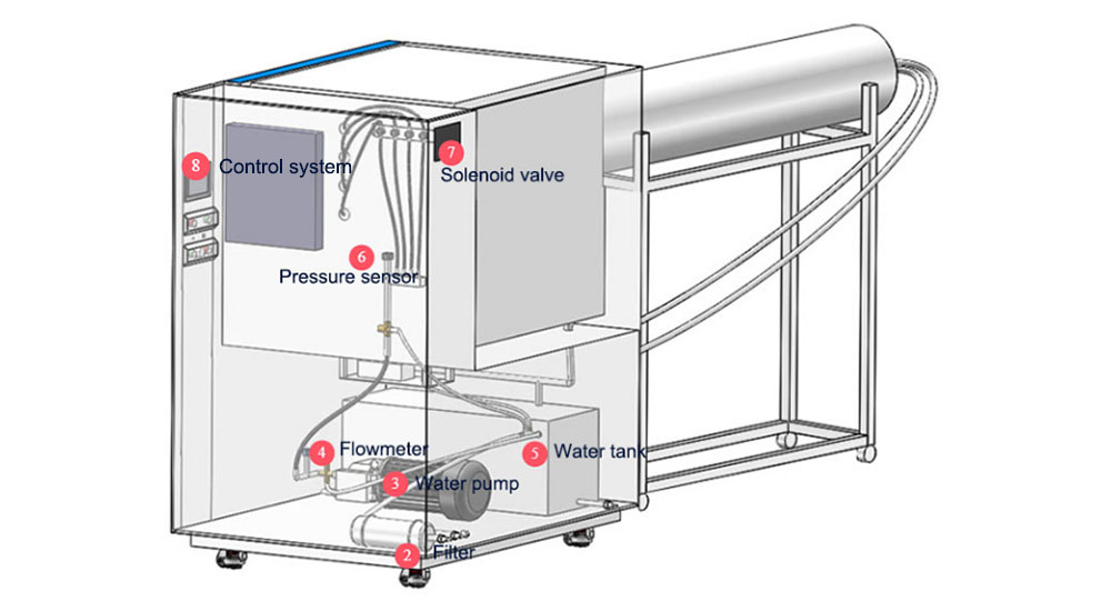 ③Pompa air | Untuk komponen inti yang menghasilkan semprotan air tekanan tinggi, tekanan air 1000kPa diperlukan untuk pengujian IPX6K; Untuk tes IPX9K, tekanan air harus mencapai 8000kPa-10000kPa. |  |